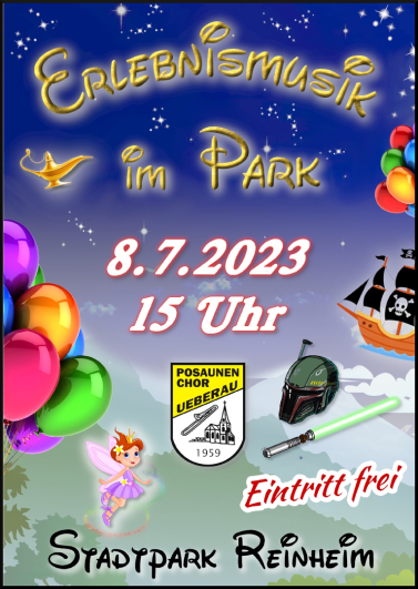 Wie auch in den letzten Jahren veranstalten wir als Posaunenchor erneut unser Sommerkonzert. Dieses trägt in diesem Jahr den Namen "Erlebnismusik im Park" und findet am 08.07. ab 15:00 Uhr im Reinheimer Stadtpark statt.